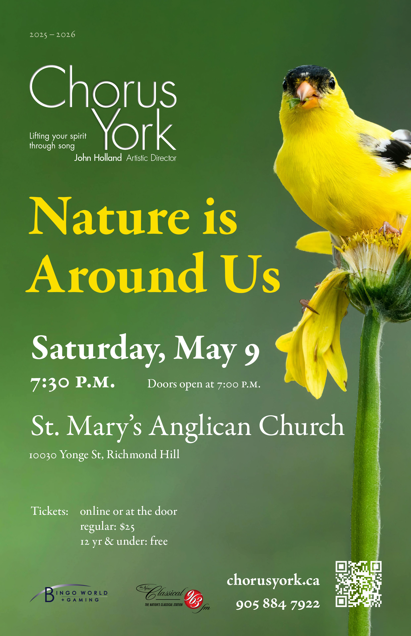 Nature is Around Us Tickets: Regular $25 online Age 12 & under free Saturday, May 9, 2026, 7:30 p.m. Saint Mary’s Anglican Church 10030 Yonge Street, Richmond Hill, Ontario John Holland, Artistic Director Purchase Your Tickets Upcoming Concerts Coming Soon
